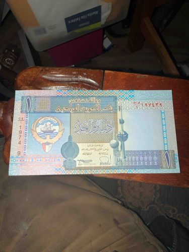 This is a Second Issue Kuwaiti One Dinar banknote, which was originally issued by the Central Bank of Kuwait starting in 1970. The banknote features a primarily light blue and turquoise color palette with intricate geometric micro-printing typical of high-security currency. The obverse side prominently displays the Coat of Arms of Kuwait on the left, featuring a dhow ship, a falcon, and the national flag. To the right, there is a detailed illustration of the iconic Kuwait Towers and an oil lamp, symbolizing the nation's modernization and heritage. The text is written in Arabic script, including the currency denomination and the signatures of the Governor of the Central Bank and the Minister of Finance. The serial number '1974' is visible on the left vertical margin. The note appears to be in relatively good physical condition with sharp corners and clean edges, suggesting minimal circulation wear. There are no obvious signs of heavy creasing, staining, or tearing, although a slight surface patina consistent with age is present. The paper quality reflects the high-standard security printing used during this era, including complex guilloché patterns intended to prevent counterfeiting. This specific series was withdrawn from circulation following the Iraqi invasion in 1990, making it a significant historical numismatic piece.