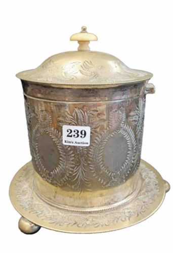 This is a Victorian-style cylindrical biscuit barrel, likely composed of silver-plate over a base metal such as copper or Britannia metal. The piece features a convex, domed lid topped with a carved bone or ivory-colored finial. The exterior is elaborately decorated with bright-cut engraving, showcasing a repetitive motif of foliate wreaths or cartouches containing unmonogrammed central ovals. The cylindrical body sits upon a fixed, wide circular underplate supported by three spherical ball feet. The construction shows beaded borders on the rim of the lid and the base, suggesting late 19th-century manufacturing typical of English silversmiths. Notable condition issues include significant oxidation and tarnish across the silver surface, along with some visible wear to the plating (bleeding) where the warm tone of the base metal is beginning to show through. The piece appears to be in its original state without significant mechanical repairs, though the lid handle shows some yellowing consistent with age. An auction sticker labeled '239 Kim's Auction' is currently adhered to the center of the body. The craftsmanship reflects the industrial artistry of the late 1800s, designed as a functional yet decorative piece for formal teatime service.