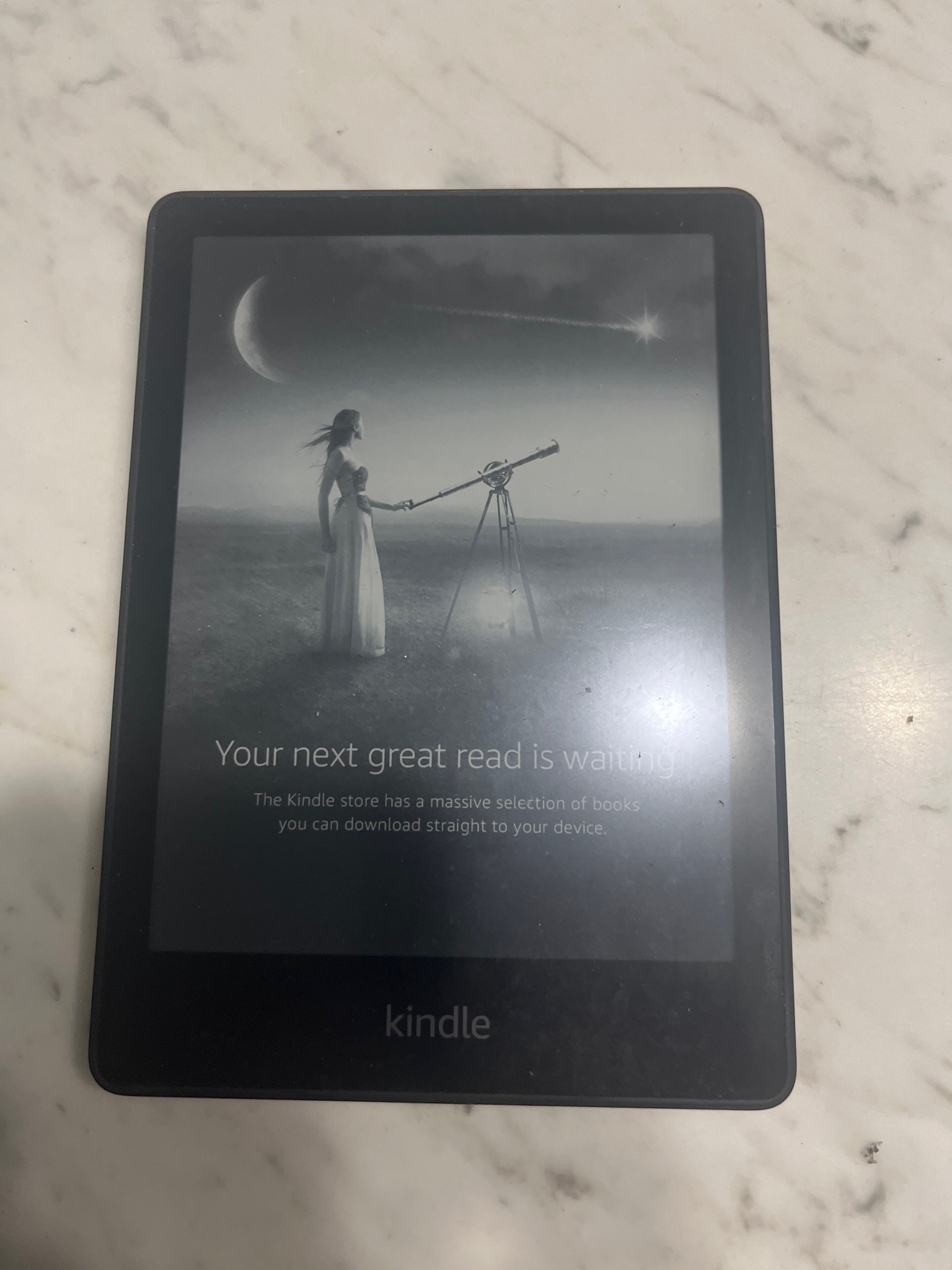 This item is an Amazon Kindle Paperwhite e-reader, specifically identifiable as the 11th generation model (released circa 2021) based on its flush-front design and thin bezels. The device features a 6.8-inch E Ink Carta 1200 touchscreen display, housed in a matte black plastic chassis with rounded corners. The lower bezel prominently displays the 'kindle' logo in a light gray font. The screen is currently showing an advertisement screen saver depicting a woman with a telescope under a crescent moon with the text 'Your next great read is waiting.' Physically, the device appears to be approximately 6.9 x 4.9 inches. In terms of condition, the device exhibits moderate signs of use including visible fingerprint smudges and surface dust on both the screen and the bezel. There are small white specks scattered across the screen area that may be superficial debris or minor pits in the screen coating. No major cracks or structural damage are visible in the photograph. The craftsmanship is typical of modern consumer electronics, utilizing high-quality injection-molded plastics and a specialized glare-free glass laminate over the electronic ink display to mimic the appearance of paper.
