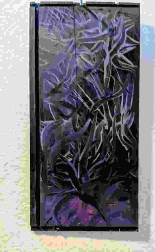 This vertical rectangular artwork is a contemporary abstract expressionist piece, likely featuring mixed media on a multi-panel wooden or composite base. The composition is characterized by dense, energetic linework reminiscent of organic botanical forms or tall seagrass, rendered in a striking palette of deep indigo, violet, and charcoal black with highlighting in pale lavender and silver-grey. The construction appears to be modular, with visible vertical seams suggesting it is composed of three or four joined panels. The application technique involves heavy layering, with areas of impasto texture and possibly sgraffito where the upper pigment layers were scratched away to reveal deeper tones. The overall aesthetic is moody and subterranean. Regarding condition, there is visible edge wear around the perimeter, particularly at the bottom horizontal edge where some chipping or paint loss is evident, suggesting a lack of a protective frame. The vertical seams show slight separation, which may be intentional or due to the natural expansion of the substrate. There are no immediate maker's marks or signatures visible on the face, pointing toward a contemporary studio origin or a semi-professional artist. The piece reflects a late 20th to early 21st-century style, prioritizing gestural movement and monochromatic depth over representational accuracy.