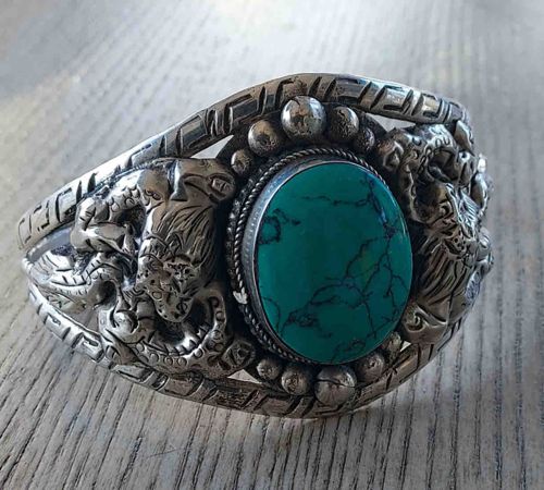 This is a substantial, wide cuff-style bracelet of ornate construction, appearing to be crafted from silver or a high-grade silver alloy, characteristic of Himalayan or Tibetan silversmithing. The central focal point is a large, oval-shaped turquoise cabochon featuring a deep teal-green hue and a fine black spiderweb matrix. The stone is securely housed in a raised bezel setting, encircled by a twisted wire 'rope' border and a halo of graduated silver spheres (raindrops). Flanking the central stone on either side are two highly detailed, repoussé-worked mythological creatures, likely Snow Lions or dragons, exhibiting intricate scales, manes, and powerful physiognomy. The outer bands of the cuff are decorated with deeply incised geometric fretwork patterns. The metalwork shows a significant amount of natural oxidation and dark patina in the recessed areas, which serves to emphasize the depth of the relief work. There is visible surface wear consistent with age, including small scuffs and a slight softening of the finer details, but the structural integrity remains sound. The quality of the hand-chased details and the substantial weight suggested by the thickness of the metal indicate a high level of craftsmanship, likely dating from the mid-20th century.
