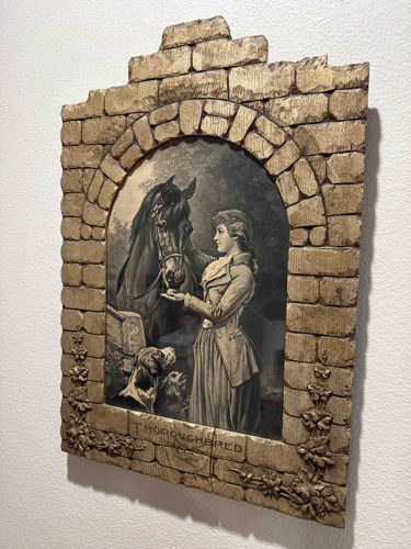 This unique piece features a monochromatic print titled 'The Thoroughbred' after a work by the renowned English painter Heywood Hardy, dated to approximately 1880. The image depicts a Victorian woman in equestrian attire feeding a snack to a large, dark horse, accompanied by two dogs, exemplifying Hardy's mastery of animal portraiture and sporting scenes. The print is characterized by its high-contrast, lithographic appearance, typical of late 19th-century mass-produced art. What makes this item particularly distinctive is its heavy, ornate frame designed to resemble a castle wall or stone archway. Likely constructed from cast plaster or a similar composite material, the frame features a stepped gabled top, a faux-stonework texture with individually defined 'blocks', and decorative floral swags at the bottom corners. The title 'THE THOROUGHBRED' is embossed directly into the stone-like base of the frame. The condition appears fair to good for its age, showcasing a significant aged patina with darkening in the recessed areas of the frame and some visible cracking or surface separation at the bottom center. The monochromatic print shows some minor foxing and typical yellowing of the paper substrate. The craftsmanship of the frame is rustic but intentional, aiming for a romanticized medieval or gothic revival aesthetic popular during the late Victorian era.