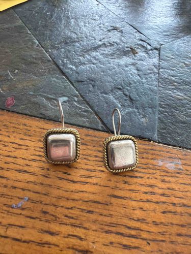 This pair of drop earrings features a sophisticated mixed-metal design, characteristic of artisan silver work from Mexico. Each earring is composed of a cushion-cut, puffed sterling silver square with a soft, domed profile. This central silver element is framed by a decorative rope or twisted cable border, finished in a contrasting yellow brass or gold-toned metal. Based on the provided context, the primary material is .925 sterling silver. The construction utilizes a French hook (or shepherd's hook) style wire, allowing for natural movement when worn. The earrings show a gentle, authentic patina, particularly in the recessed areas of the rope border and along the edges of the silver squares, which highlights the textural details. The silver surfaces exhibit fine micro-scratches consistent with age and previous wear, but no significant dents or deep abrasions are visible. This style is consistent with mid-to-late 20th-century Mexican jewelry making, often hailing from regions like Taxco, known for blending traditional geometric forms with modern metalworking techniques. The craftsmanship appears solid and hand-finished, evidenced by the slight organic variations between the two pieces.