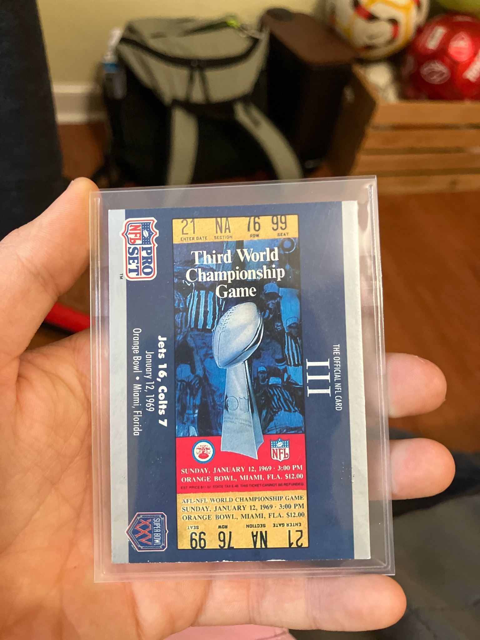 This is a 1990 Pro Set football trading card specifically produced as part of the Super Bowl XXV commemorative set. The card features a blue-dominated design displaying graphic artwork of the original ticket for the 'Third World Championship Game' (Super Bowl III), held on January 12, 1969, at the Orange Bowl in Miami, Florida. The card commemorates the famous matchup where the Jets defeated the Colts 16-7. Physically, the card is standard 2.5 by 3.5 inches, printed on cardstock with a glossy finish. It incorporates the Pro Set logo, the official Super Bowl XXV logo, and various NFL official markings. Notable details include the printed seat information 'Enter Gate 21, Section NA, Row 76, Seat 99' and the $12.00 original ticket price reproduced in the artwork. The card appears to be in Excellent to Near Mint condition, presented within a protective clear plastic top-loader. The edges and corners see minimal wear as viewed through the protector, and the centering appears slightly biased toward the top. This item was manufactured in 1990 to celebrate the 25th anniversary of the Super Bowl and serves as a historical retrospective piece for sports collectors.