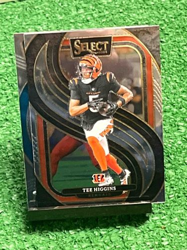 This is a modern sports trading card featuring Tee Higgins of the Cincinnati Bengals from the 2021 Panini Select football series. The card utilizes a premium chromium-style construction with a metallic, reflective finish. Its design features dynamic, curved geometric patterns in black, silver, and orange, mimicking the team's colors. The player is depicted in an action pose wearing the Bengals' black home jersey and orange helmet. Notable branding includes the 'Select 2021' logo at the top and the player's name and team logo at the bottom. The card appears to be in good raw condition, showing sharp corners and clean edges based on the visual evidence, though surface scratches are common for this high-gloss 'prizm' style of card. The craftsmanship is typical of Panini's high-end Select brand, known for its tiered 'Concourse', 'Premier Level', and 'Field Level' subsets. This specific layout suggests a standard base or die-cut parallel from the set.
