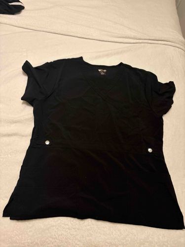 This item is a short-sleeved, v-neck medical scrub top in a deep black hue, likely constructed from a polyester-rayon-spandex blend common in modern performance medical apparel. The garment features a wrap-style or 'mock-wrap' neckline and a tapered feminine fit. A notable design element is the decorative waist detailing, which includes horizontal fabric tabs accented by two silver-toned metallic buttons or rivets on the front hips. The top includes two large lower patch pockets integrated into the seams for utilitarian storage. Construction appears durable with reinforced stitching and soft, flexible fabric intended for mobility and long shifts. There is a visible brand heat-transfer label on the inside neck, though the specific brand name is slightly blurred; it appears to be a contemporary medical uniform brand like Barco, Cherokee, or FIGS. The item shows signs of light use with minor wrinkling across the torso but maintains its deep color saturation without visible fading, pilling, or structural damage. The style is late 20th to early 21st century, representing modern professional healthcare attire focusing on both function and aesthetic appeal.