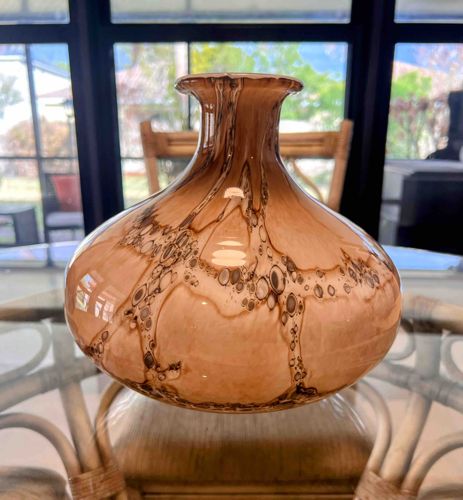 This is a contemporary hand-blown glass vase featuring a squat, bulbous body that tapers into a slender neck with a flat, polished rim. The vessel exhibits an intricate internal design characterized by dynamic swirls and 'pitted' organic patterns in varying shades of amber, chocolate brown, and cream. This aesthetic resembles polished stones like tiger's eye or agate. The glass has a high-gloss finish, reflecting ambient light smoothly across its surface, which indicates high-quality polishing and a lack of surface abrasions. The bottom of the vase likely features a ground pontil mark, a standard indicator of handmade glassware. The distribution of the brown pigments creates cellular formations that spread upward from the base toward the neck, suggesting a sophisticated glass-blowing technique where different colored frits or powders were manipulated during the shaping process. The piece is in excellent condition with no visible chips, cracks, or clouding. Its style suggests it was likely produced in the late 20th to early 21st century, possibly by a boutique studio glass artisan. The heavy density and clarity of the glass suggest a leaded crystal or high-quality soda-lime composition.