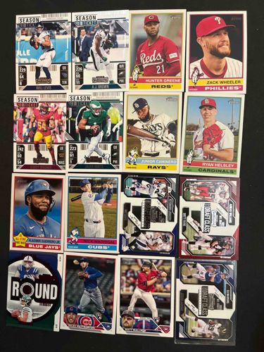A diverse lot of sixteen contemporary sports trading cards, featuring players from Major League Baseball (MLB) and the National Football League (NFL). The assembly includes a variety of brands and series, notably Topps Heritage, Topps Base, Panini Contenders 'Season Ticket,' and 'Draft Class' designs. Key featured athletes include Vladimir Guerrero Jr. (Blue Jays), Hunter Greene (Reds), Will Levis (Titans), and Jalen Hurts (Eagles). The cards are constructed of standard cardstock with varied finishes; some feature high-gloss coatings while others have the matte, vintage-style finish characteristic of the Heritage line. The collection showcases different layouts, including standard vertical portraits, horizontal action shots, and specialized graphic designs like the Panini Contenders 'rounded' circular inset card. The manufacturing dates likely span from 2021 to 2024, reflecting current professional rosters. In terms of condition, the cards appear to be in 'Near Mint' to 'Mint' raw condition, with sharp corners and clean edges visible in the layout, though microscopic surface wear cannot be ruled out without closer inspection. One card on the bottom right is housed in a protective plastic top-loader, while the others are shown loose. The set displays vibrant color saturation and high-quality printing technology typical of modern trading card production.