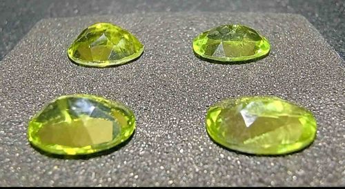 This lot consists of four faceted peridot gemstones, characterized by their distinct yellowish-green to lime-green olive hue. The stones are cut in an oval shape with a rose-cut style or shallow dome faceting visible on the upper surface. Each gemstone displays a high degree of transparency and vitreous luster, indicating quality mineral specimens from the olivine group. The dimensions appear relatively uniform, though individual carat weights remain undetermined without a scale. The physical condition shows clean facets with minimal visible abrasions on the table or crown areas. These stones exhibit the classic 'oily' or greasy luster common to peridot. No significant internal inclusions like 'lily pads' are immediately visible at this magnification, suggesting high clarity. These are contemporary faceted stones suitable for jewelry settings such as rings or earrings. The craftsmanship displays symmetrical point junctions and polished girdles, marking them as standard commercial-to-fine grade loose gems. The background material is a textured dark grey foam, used for display and protection.
