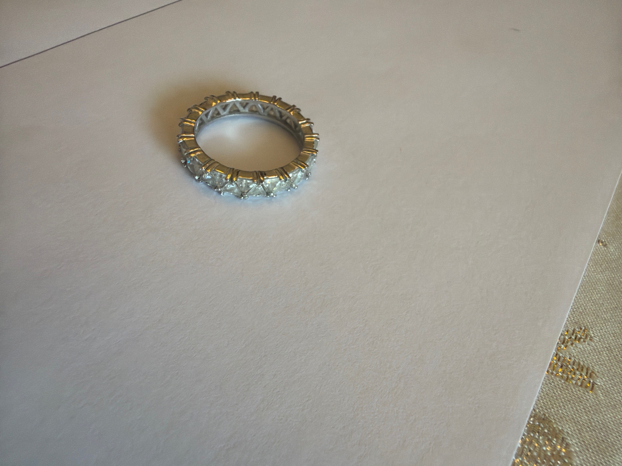 This is a full eternity wedding band featuring a continuous row of princess-cut gemstones, likely diamonds, set in a shared-prong or common-prong configuration. The metal is white in color, suggesting a composition of 14k or 18k white gold, or perhaps platinum. The stones are square-shaped with sharp corners, characteristic of the princess-cut, and are oriented point-to-point along the circumference of the band. The gallery of the ring features an open, geometric lattice design (v-shaped cutouts) which allows maximum light penetration to enhance the brilliance and fire of the stones from multiple angles. The ring appears to be of modern construction, likely late 20th century to contemporary. Physically, the band has a uniform width of approximately 3mm to 4mm. The craftsmanship shows precise stone setting with uniform prongs. Regarding condition, there is light surface wear visible on the exposed metal prongs consistent with regular use, but no missing stones or significant structural deformations are immediately apparent. No specific maker's marks or hallmarks are visible from this top-down perspective, but such marks are usually found on the interior shank of high-quality fine jewelry. The overall quality suggests a high-end commercial or custom piece designed for durability and high visual impact.