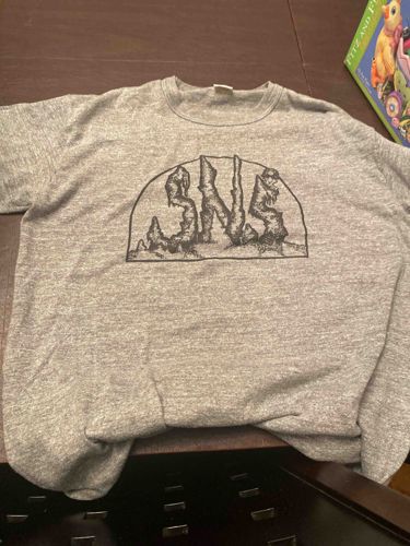 This item is a short-sleeved crewneck t-shirt made of a heather gray knit fabric, likely a cotton-polyester blend given the visible marled texture. The central design element is a large black screen-printed graphic on the chest. The graphic features a stylized semi-circular border containing the letters 'SNS' rendered in a unique, organic, and textured font that resembles rock formations, melting ice, or topographical elements. The shirt features standard double-needle stitching along the sleeves and bottom hem, which is a common indicator of modern apparel manufacturing. There is a visible white fabric tag at the interior neckline, though the specific brand details are obscured from this angle. The item appears to be in good pre-owned condition with no significant staining, tears, or holes visible, though there is general fabric wrinkling consistent with storage and light wear. Based on the graphic style and garment construction, it likely dates to the early 21st century. The print quality suggests a standard commercial screen-printing process.