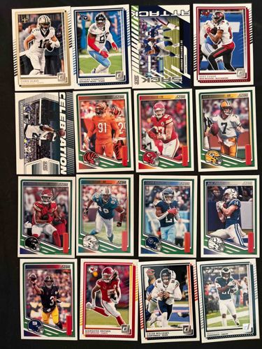 This is a collection of 16 modern American football trading cards from the 2023 and 2024 seasons, primarily from the Panini Donruss and Score brands. The cards are standard 2.5 by 3.5 inches, printed on high-gloss cardstock with high-resolution action photography of NFL players. Notable players include Chris Olave, Mike Evans, Jalen Hurts, and rookie prospects like Caleb Williams. The Panini Donruss cards are identifiable by the 'Rated Rookie' logo or the stylized 'D' branding, featuring clean white borders. The Score cards feature a green and red border aesthetic with team logos at the bottom corner. Some cards are horizontal 'Sack Attack' or 'Celebration' inserts. Many of the cards have red pull-tabs attached to the back, suggesting they were recently removed from protective penny sleeves or top-loaders. The cards appear to be in Near Mint to Mint (NM-MT) condition, with sharp corners, clean edges, and no visible surface scratches, creases, or fading. The printing quality is consistent with modern manufacturing standards including foil stamps and vibrant color saturation. This set represents contemporary sports memorabilia valued by collectors for rookie year potential and team building.