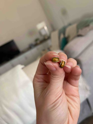 A pair of small, oval-shaped post earrings featuring natural Tiger's Eye gemstones. Each earring displays the characteristic chatoyancy of Tiger's Eye, showing alternating bands of golden-yellow and warm brown light that shift when viewed from different angles. These semi-precious stones are polished into smooth, cabochon-style domed ovals and are securely held by a minimalist silver metal bezel or semi-wrap setting. The metal appears to be sterling silver based on the slight tarnished patina visible around the edges, though no hallmarking is visible in the photograph due to the scale and orientation. The construction is simple and modern, suggesting a mid-to-late 20th-century or early 21st-century origin. Condition appears good with minor surface oxidation on the metal components, which is consistent with age and gentle use. The gemstones appear intact with no visible fractures or significant chips. The small scale (approximately 5-7mm in length) characterizes them as everyday jewelry or minimalist accessories. The quality of the stone cutting is uniform, and the polish is bright, indicating competent lapidary craftsmanship despite their modest size.