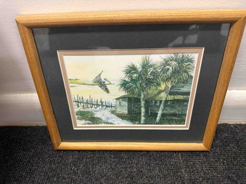 This item is a framed landscape-oriented artwork depicting a serene coastal scene, likely a print of a watercolor original. The composition features a large brown pelican in mid-flight over a shoreline, adjacent to two prominent palm trees and a rustic, weathered wooden beach shack or 'fish camp' style building. The color palette is composed of naturalistic greens, sandy beige, and soft yellow highlights in the sky, suggesting early morning or late afternoon light. The artwork is professionally matted with a double-matting technique featuring a dark charcoal-grey primary mat and a thin white or cream-colored inner bevel. It is housed in a mid-tone oak or honey-colored solid wood frame with a simple rounded profile. The construction appears to be from the late 20th century, approximately 1980s to 1990s. The condition appears to be fair to good; while the frame and glass are intact, there is a visible indentation or 'pock' mark on the upper left-hand side of the wooden frame, and the paper backing or matting may show slight signs of age-related acidity or yellowing upon closer inspection. No artist signature is clearly visible from this distance, but the style is characteristic of regional Florida or Gulf Coast landscape art.