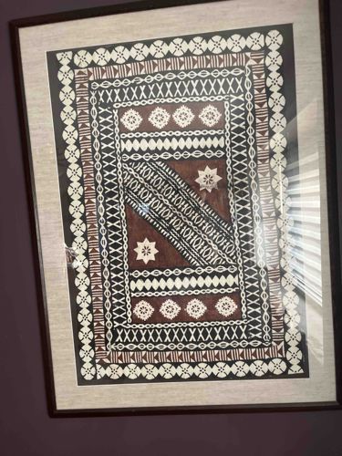 This item is a traditional Fijian Masi, also known as tapa cloth, which has been professionally matted and housed in a dark wood frame under glass. The artwork is created from the inner bark of the paper mulberry tree, which is beaten into a felt-like fabric and decorated with natural dyes. The color palette is classic for this medium, featuring deep charcoal blacks and earthy reddish-brown tones against the natural cream-colored background of the bark fiber. The composition is highly geometric, consisting of several concentric decorative borders surrounding a central divided panel. Notable motifs include the 'manulua' (eight-pointed star), repetitive 'X' patterns representing netting or weaving, and various serrated and circular stenciled boundaries. The craftsmanship exhibits typical handmade characteristics, with slight variations in the intensity of the pigment and hand-stenciled alignment. The fabric displays a visible fibrous texture, indicating the organic origins of the material. Condition-wise, the cloth appears well-preserved within its frame, with no significant fraying or discoloration visible beyond the expected irregularities of natural bark cloth. There is some minor reflection on the glass from external lighting, but the underlying piece shows strong contrast. This style of decorative masi is contemporary, likely mid-to-late 20th century, intended for the domestic and tourist art markets while maintaining traditional symbolic language.
