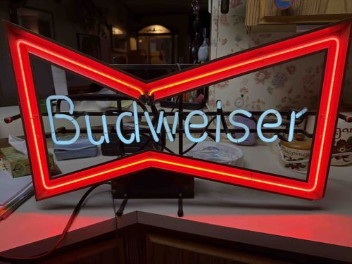 This is a vintage Budweiser neon beer sign featuring the brand's iconic 'bowtie' logo. The sign is constructed with hand-blown glass tubing filled with neon and argon gas, mounted onto a black metal frame. The perimeter consists of a double-bordered red neon tube that outlines the classic bowtie shape, while the 'Budweiser' script is executed in a cool white or ice-blue neon. The sign is housed in a red metal housing that protects the outer tubes and provides structural rigidity. The overall condition appears excellent, with all gas-filled tubes functioning with a bright, consistent glow and no visible breaks or dark spots. The metal frame shows minor signs of age and patina consistent with a late 20th-century production era, likely from the 1980s or 1990s. The sign includes a heavy-duty transformer and power cord, which are essential for high-voltage glass neon operation. The craftsmanship is high, evidenced by the clean bends in the glass lettering and the symmetry of the outer logo frame. This type of signage was a staple in American bars and taverns, making it a highly collectible piece of breweriana advertising.