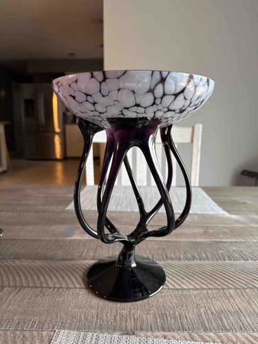 This is a sophisticated piece of contemporary art glass, featuring a wide, shallow bowl resting atop an intricate pedestal base. The bowl is crafted with a white opalescent glass that has been manipulated to create a reticulated or 'python' skin effect, showing dark purple or black veins through the white surface. The base is particularly striking, composed of multiple pulled glass tendrils in a deep violet-black that intersect to form a cage-like support. These tendrils emerge from a solid circular foot and flare outwards to cradle the bowl. The piece appears to be hand-blown and hand-shaped, indicative of studio art glass craftsmanship rather than mass production. The condition appears excellent with a high glossy finish and no visible fractures or chips in the delicate stem work. While no maker's mark is visible in the photograph, the style and execution are reminiscent of individual glass artists' work from the late 20th to early 21st century. The organic, almost biological form of the base provides a nice contrast to the geometric regularity of the bowl's pattern. Effort was clearly made to balance the weight of the wide bowl over the narrow contact points of the stem.