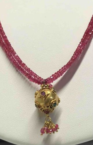 A sophisticated handmade jewelry ensemble featuring a central 18-karat yellow gold orb pendant suspended from a double-strand necklace of faceted red spinel beads. The focal pendant is a spherical gold bead meticulously embellished with ornate granulation and wirework settings. It is inset with a variety of small round cabochon and faceted gemstones, including contrasting green emeralds and pinkish-red rubies. The base of the orb features a decorative cluster of hanging faceted red spinel bead charms, providing movement and texture. The overall composition displays a high level of artisanal craftsmanship, reminiscent of Byzantine or traditional Indian goldwork styles. The 18kt gold shows a rich, matte yellow patina consistent with high-purity gold alloys. The spinel beads are uniformly cut and display a vibrant magenta-red saturation. The construction appears sound with secure wire-wrapped joins and a functional 18kt gold lobster-style clasp. This piece represents a semi-contemporary custom design, likely produced within the last 20 years, focusing on the blend of rich yellow gold and saturated colored gemstones. No visible missing stones or significant structural damage are noted, suggesting excellent condition.
