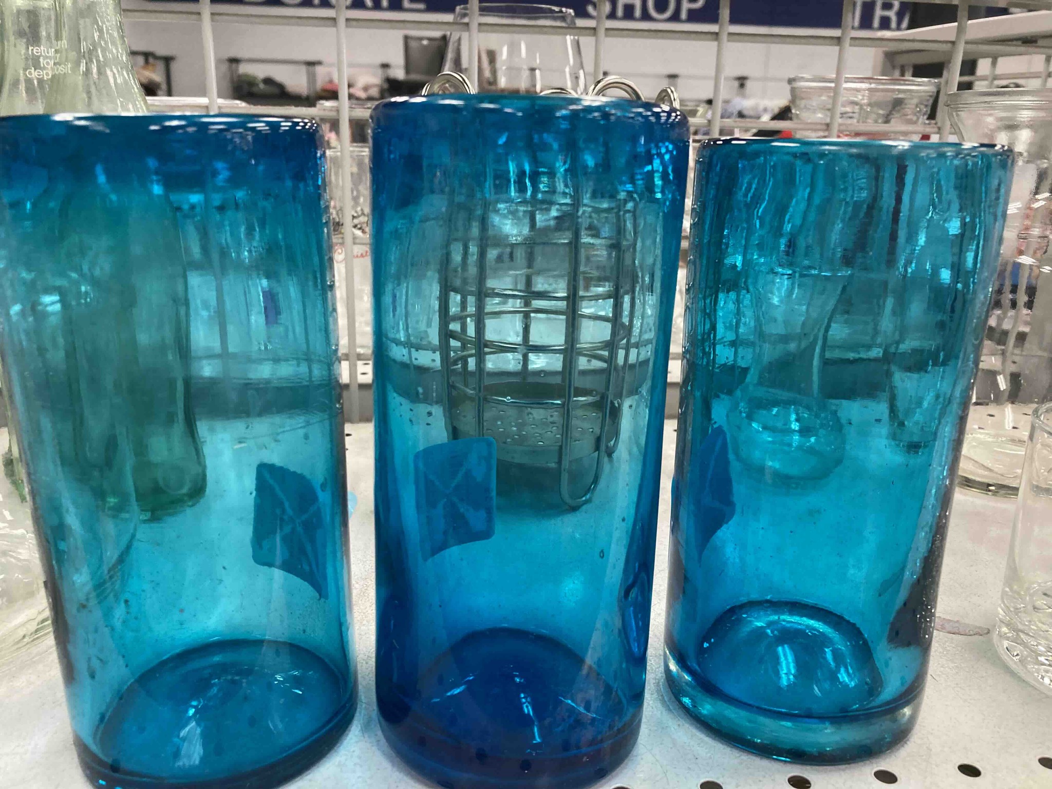 This set of three matching turquoise glass vessels exhibits the characteristic markers of artisanal hand-blown glass production. Each piece features a tall, cylindrical silhouette with slightly irregular vertical walls and softly rounded rims that vary marginally in height, confirming the handmade nature of the glass. The color is a vibrant, translucent turquoise or 'Baja blue' with a subtle 'pitted' or 'seeded' texture throughout, containing numerous tiny air bubbles (seeds) suspended within the glass matrix. The base of each cylinder shows a distinct, deep pontil scar or 'kick-up,' indicative of traditional glassblowing techniques where the vessel was held by a rod during construction. Each cylinder bears a square, blue brand sticker featuring a white cross or windmill-like logo, suggesting a contemporary manufacturer or boutique importer. The glass possesses a heavy, substantial gauge with a slightly uneven thickness at the bottom, which adds to its rustic, coastal charm. In terms of condition, the pieces appear well-preserved with no visible chips or significant fractures, though there is minor surface dust and adhesive residue from the labels. The craftsmanship suggests a style consistent with Mexican recycled glass artistry from the late 20th or early 21st century.