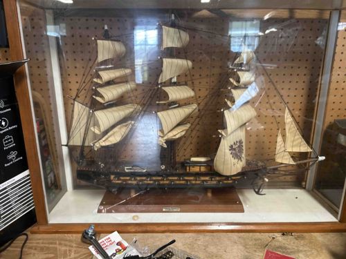 This is a detailed, scale-model replica of a Spanish frigate from the year 1780, housed within a protective glass and wood display case. The ship is a three-masted wooden vessel featuring a dark-stained hull with a distinct painted yellow or gold band along the gun deck, highlighting the row of miniature cannons. The rigging is complex and appears largely intact, supporting numerous off-white fabric sails that exhibit a subtle striped pattern and weathered patina. A notable feature is the large heraldic eagle or crest printed on the foresail, indicating its Spanish naval affiliation. The model sits atop a tiered wooden base with a nameplate that reads 'Fragata Española - Año 1780'. The construction involves various materials including wood for the hull and masts, metal for the anchors and cannons, and fine thread for the rigging. The craftsmanship is high-quality, typical of mid-20th-century nautical kits or professional artisan work. Regarding condition, the model shows age-related yellowing of the sails and some accumulation of dust within the case. While the exterior glass case is functional, there is visible wear on the wooden framing and surrounding pegboard environment. Overall, it serves as a fine example of maritime folk art or commemorative modeling, likely manufactured between 1970 and 1990 as part of a high-end collector series.