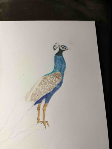 This is an original work of art executed on heavy-weight white paper, likely cardstock or mixed-media paper. The central subject is an Indian blue peacock, rendered primarily in colored pencil with visible graphite under-sketching. The piece remains in an 'in-progress' state; the head, neck, and torso are largely complete, featuring vibrant shades of cobalt and cerulean blue with intricate feather texturing. The wing area displays a distinct scalloped pattern in cream and bronze tones, while the legs are finished in an ochre-gold hue. A notable feature is the fanned crest on the bird's head, which shows careful attention to detail with fine black and white lines. The long tail feathers and the branch the bird is perched upon are currently only visible as faint, unfinished graphite outlines. There are no visible maker's marks, signatures, or dates on the front of the piece. The overall condition is good, though there is a faint smudge or fingerprint near the top edge of the paper and some minor stray graphite marks in the white space. The style is contemporary botanical or zoological illustration, showcasing a high level of patience and craftsmanship in the blending of colors and layering of textures to create a realistic three-dimensional effect.