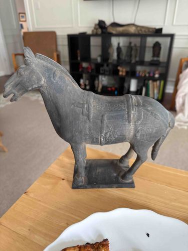 This is a ceramic funerary sculpture of a standing horse, designed in the classic style of the Chinese Tang Dynasty (618–907 AD), though likely a mid-20th-century or modern reproduction for the decorative market. The figure is constructed from a dark gray earthenware or terracotta, featuring a matte, weathered finish that mimics 'unglazed' burial pottery. It stands atop a rectangular integrated plinth for stability. The horse is depicted with an open mouth, alert ears, and a docked tail. Notable features include a detailed saddle and caparison (harnessing) decorated with incised geometric patterns and circular motifs. The surface displays significant artificial 'patina,' which includes calcified white deposits and superficial abrasions intended to simulate centuries of burial in soil. The craftsmanship shows stylized anatomical proportions typical of ancient Chinese art, emphasizing a strong neck and sturdy legs. While it lacks visible maker's marks, the uniform wear and the specific carving style of the harness suggest it is a high-quality decorative piece. Condition appears stable with no major structural cracks visible, although the deliberate surface distressing makes it difficult to distinguish between intentional 'antiquing' and minor modern chips.