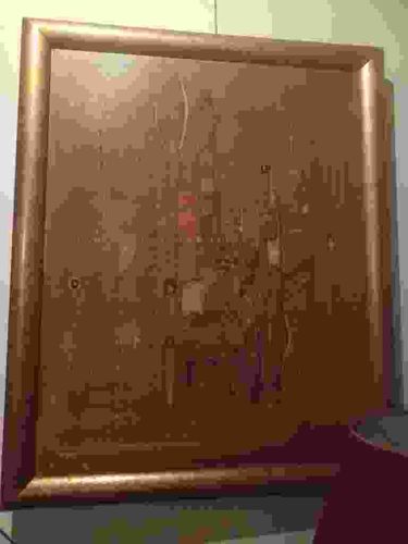 This item is an aged, framed painting featuring an abstract figurative subject. The artwork is housed within a substantial, cove-molded frame with a metallic gold or bronze finish. The composition appears to be rendered in a monochromatic to polychromatic earth-tone palette, dominated by browns and ochres, with a distinct vertical red stroke near the center providing a focal point. The central figure is highly stylized and elongated, reminiscent of early 20th-century expressionism or mid-century abstract styles. In terms of condition, the piece shows significant signs of age and distress including several surface abrasions, small holes or punctures in the substrate, and general foxing or darkening of the varnish layer. The frame also exhibits wear consistent with its age, showing minor scuffing and loss of the gilded finish. No visible artist signature or maker's mark is discernible from the image, but the overall presentation suggests a mid-to-late 20th-century origin. The texture of the paint appears thin, possibly indicating oil or acrylic on a board or canvas substrate that has weathered over time. The craftsmanship reflects a deliberate exploration of form and color, prioritizing mood and abstraction over realism.