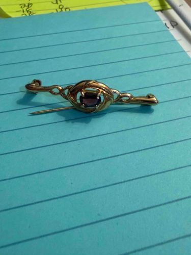 This is a vintage bar-style brooch featuring a central oval-cut deep purple gemstone, likely an amethyst or high-quality glass paste. The gemstone is secured in a four-prong setting within a decorative, intertwined knot-like circular centerpiece. The metal appears to be gold-filled or high-quality gold plating, showing a rich, warm luster consistent with mid-20th-century jewelry. The horizontal bar extends from either side of the central motif with open-work loop details near the center and solid tapered ends. On the reverse, the piece is equipped with a classic pinstem and a rollover safety clasp mechanism, though the pinstem is currently shown in the open position. The construction suggests a style period ranging from the late Art Deco era to the mid-century modern period (circa 1940s-1960s). Regarding condition, the metal shows minor surface scratches and a light patina appropriate for its age, without significant plating loss. The central stone appears securely set with no visible chips from this angle. While the user mentions a signature resembling 'Park Long,' it is likely a maker's mark for Park Lane, a well-known costume jewelry brand established in 1955, which would align with the craftsmanship and stylistic elements observed.