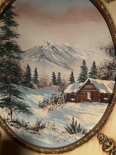 This is an original landscape painting set within a circular or oval format, executed in an expressive, impasto style typical of late 20th-century decorative art. The scene depicts a tranquil snow-covered wilderness featuring a rustic log cabin nestled among towering evergreen trees, with jagged, snow-capped mountains in the background under a soft, mauve-toned sky. The artist uses a palette of cool blues, whites, and earthy browns, with thick brushstrokes adding physical texture to the snow and foliage. Notable features include a warm light glowing from the cabin window, suggesting habitation. The piece is signed 'Shara Winslow' and dated '84' with a copyright symbol, indicating it was produced in 1984. The painting is housed in a gold-finished decorative metal frame with ornate filigree floral accents at the corners. The condition appears fair to good with some visible shelf wear and minor scuffing on the frame edges; however, the paint surface itself appears intact without major cracking. This style of painting was popular in the 1980s as accessible home decor, emphasizing a cozy, wilderness aesthetic.