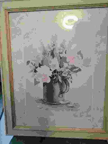 This item is a framed decorative still life print featuring a bouquet of flowers arranged in a dark, handled pitcher or jug. The artwork utilizes a muted color palette consisting primarily of gray, cream, and soft pink tones, characteristic of mid-20th-century interior decor. The composition is centered on a light-colored background that appears to have an aged, textured appearance, possibly due to the original printing substrate or light damage. The frame is constructed of wood with a light green or 'avocado' paint finish, adorned with a thin gold-toned inner fillet or 'bead' that provides a classic contrast. Physically, the piece appears to be a medium-sized rectangular vertical print. Notable features include the simplified, almost Impressionistic rendering of the petals and leaves, which suggests a mass-produced decorative style from the 1960s or 1970s. Regarding condition, there is visible light glare on the protective glass surface which may obscure fine details. The matting appears integrated or part of the print itself, showing some potential acid-burn yellowing along the edges indicative of age. No specific maker’s marks or signatures are clearly legible at this resolution, but the overall craftsmanship suggests a high-quality commercial reproduction intended for home furnishing. The frame shows some minor edge wear consistent with a vintage item of this period.