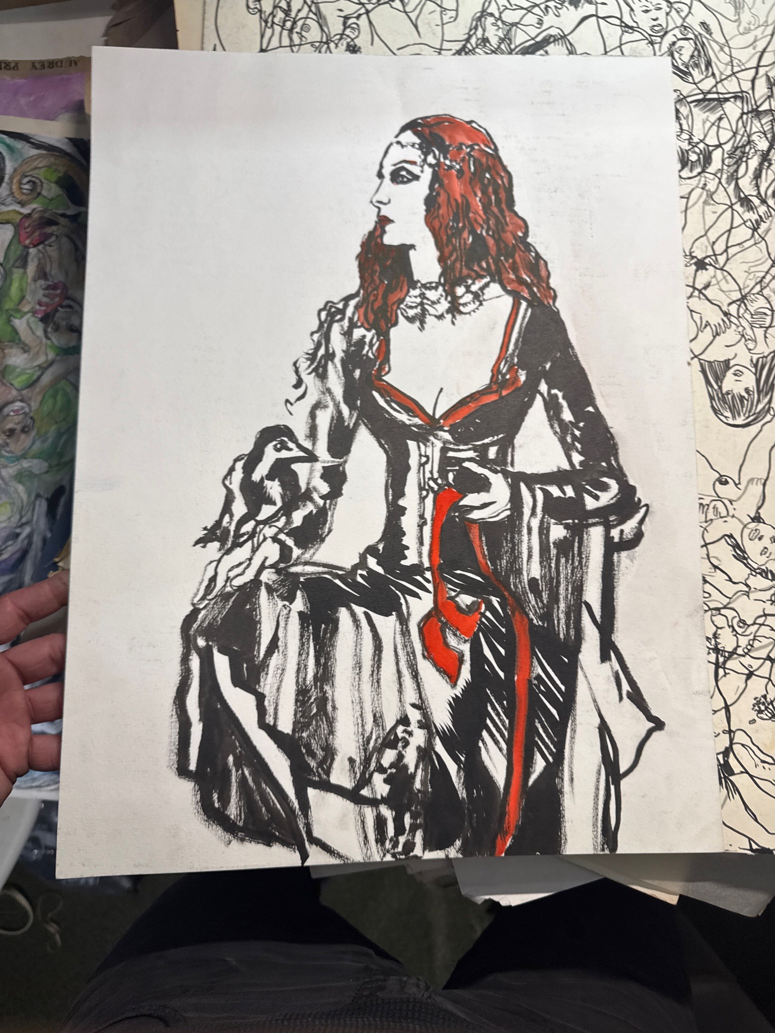 This is a hand-drawn mixed media illustration on white art paper, likely executed in ink, marker, and potentially gouache or acrylic for the color accents. The artwork depicts a woman in a stylized Gothic or Neo-Romantic fashion, characterized by a high-contrast black and white palette with bold red highlights in her hair, bodice trim, and a flowing ribbon held in her hand. She is seated and shown in profile, wearing an ornate, low-cut gown with Corset-style detailing and a lace choker. A small, dark bird—possibly a crow or raven—is perched on the skirt of her gown near her hip. The illustration style is expressionistic, with thick, gestural brushwork and heavy ink deposits creating shadows and depth, contrasted by finer line work in the facial features and hair. There are no visible artist signatures on the face of the work, though the paper appears to be part of a larger portfolio, as seen by other sketches in the background. The condition appears fair, with some slight rippling to the paper consistent with wet media application, and light handling wear along the edges. The overall aesthetic suggests a contemporary decorative illustration or a piece of concept art from the late 20th to early 21st century, focusing on dark fantasy or alternative subculture themes.