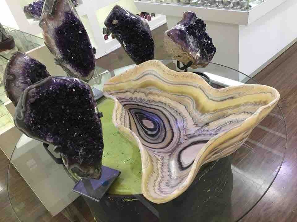 Carved Agate Decorative Bowl and Amethyst Geodes