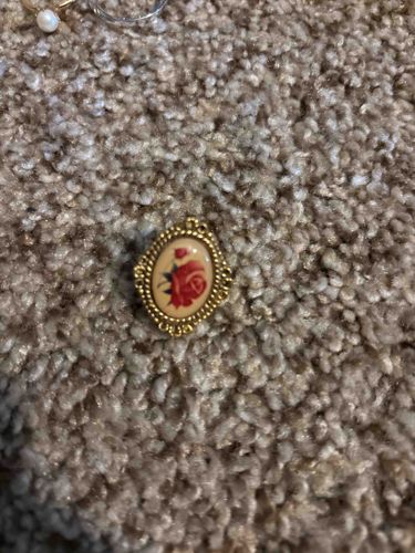 This item is a vintage-style miniature brooch featuring an oval-shaped cabochon with a floral motif. Specifically, the central figure is a red rose with green leaves on an aged cream or ivory-colored background. The central plaque appears to be made of either porcelain, enamel, or ivory-colored resin. It is encased in a gold-toned metal frame that exhibits a detailed decorative border consisting of granular metalwork and small loops, characteristic of costume jewelry from the mid-20th century. The frame's texture resembles a beaded or rope-style filigree edge. This piece is small, likely measuring under 1.5 inches in height, and is typical of 'cottagecore' or Romantic-style aesthetic. The condition appears fair to good for its age, with visible darkening or patina on the gold-toned metal and slight discoloration on the cream background, which suggests a possible age range from the 1960s to the 1980s. There are no visible maker's marks or signatures on the front, but the craftsmanship suggests a mass-produced yet charming decorative accessory intended for personal wear on lapels or scarves.