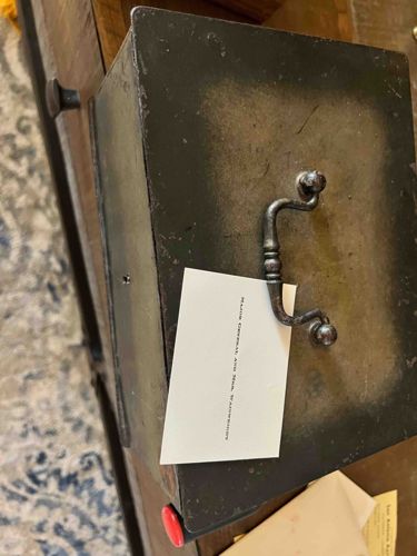 This item is a vintage industrial-style metal storage box, likely intended for securing cash, documents, or personal valuables. The box is constructed from heavy-gauge folded sheet steel, featuring a dark olive green or charcoal painted finish that shows significant age-related wear. It is rectangular in shape with a flat lid. On the top, there is a prominent wrought iron or cast steel swing handle with a turned, decorative grip section, mounted on two sturdy pivot points. The condition is consistent with an early-to-mid 20th-century utilitarian object, exhibiting an aged patina, surface oxidation (rust) on the handle, and scuffing, paint loss, and general grime across the metallic surfaces. A small hole is visible on the side flange, suggesting a point for a locking mechanism or rivet. The box appears to be hand-assembled or early machine-stamped with simple, durable hinges. A white calling card is tucked under the handle, reading 'Major General and Mrs. Wainwright' in small black print, which may suggest a provenance related to a military officer, though the box itself is a standard industrial design. The craftsmanship is robust and functional rather than decorative.