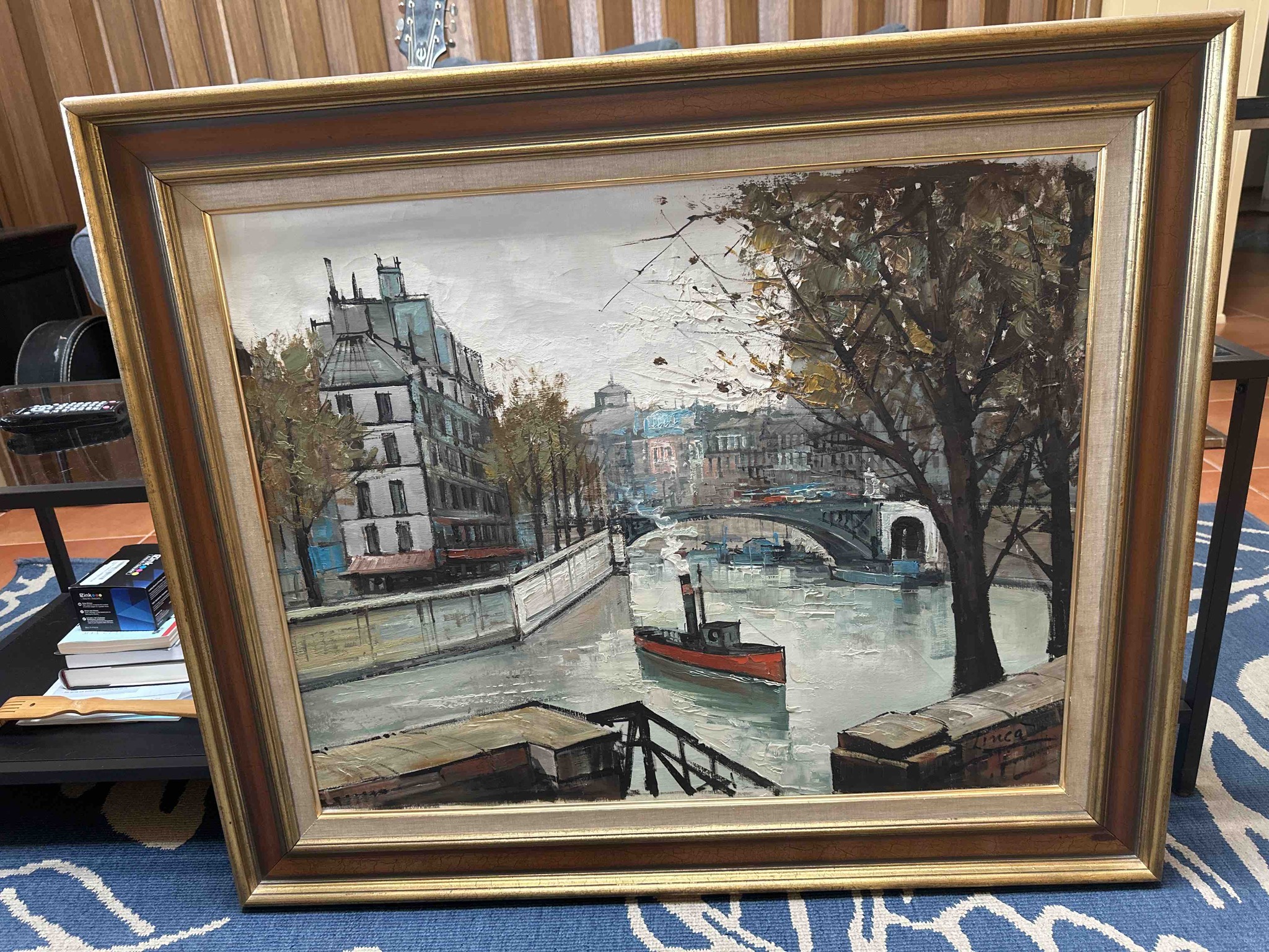 This is an original oil painting on canvas, signed 'Linca' in the lower right corner. The artwork depicts a European city scene, most likely Paris, featuring the Seine River with a small red steam tugboat in the foreground and an arched bridge in the background. The style is mid-to-late 20th-century Impressionism, characterized by heavy impasto and palette knife techniques that create a textured, three-dimensional surface. The color palette is composed of muted greys, overcast sky whites, and earthy ochres, punctuated by the vibrant red of the boat. The composition is framed by detailed architecture on the left and a large, dark tree on the right, providing a sense of depth and perspective. The painting is housed in a substantial multi-tiered wooden frame with a gilded finish and a beige linen liner. The frame shows minor signs of age, including some light dust accumulation and small abrasions on the corners. The canvas itself appears to be in good stable condition with no visible tears, though there is natural craquelure consistent with oil paint of this thickness and age (estimated mid-20th century). The craftsmanship is characteristic of 'European School' decor art produced for the international market, showcasing high technical skill in texture and atmospheric light.