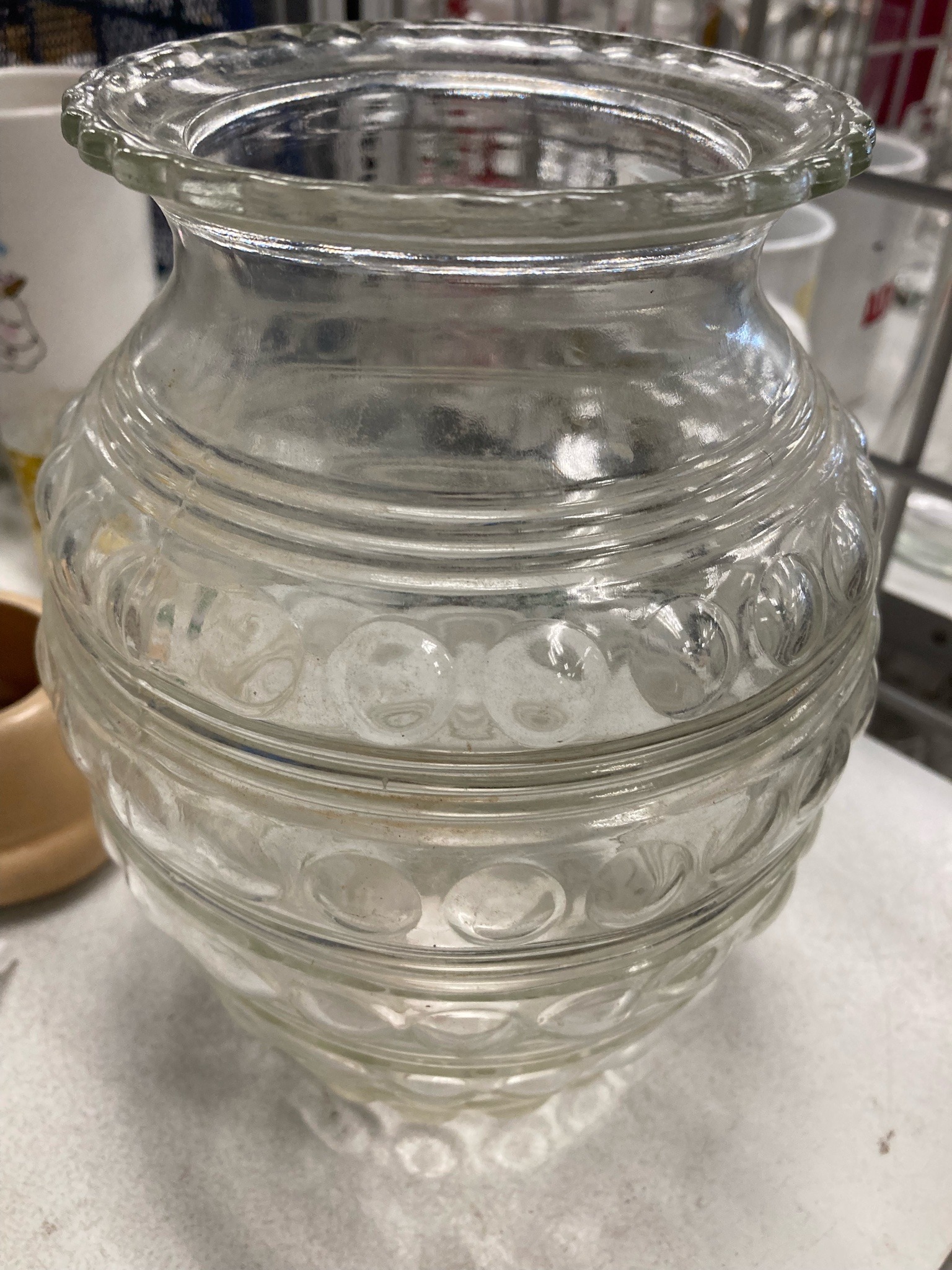 This is a vintage bulbous-shaped vase made of heavy clear pressed glass, specifically matching the popular 'Wexford' pattern produced by Anchor Hocking between 1967 and 1998. The piece features a distinct textured design consisting of horizontal bands and rows of raised circular or bubble-like indentations (often referred to as 'beaded' or 'thumbprint' style). The rim is flared with a scalloped or notched edge, which is characteristic of this mid-century glass line. Physically, the vase is medium-sized and appears to be made from soda-lime glass, exhibiting a clear, colorless appearance without significant yellowing. The construction shows some vertical mold seams, typical of mass-produced machine-made glassware of the late 20th century. Condition-wise, the glass maintains good clarity, though there is visible surface residue or cloudiness on the interior, likely due to water mineral deposits from previous use. No significant chips or cracks are immediately visible on the exterior pattern, although minor flea bites along the notches of the rim or base would be common for this age. This style was highly popular for its durability and brilliant reflective properties, often used for everyday floral arrangements.