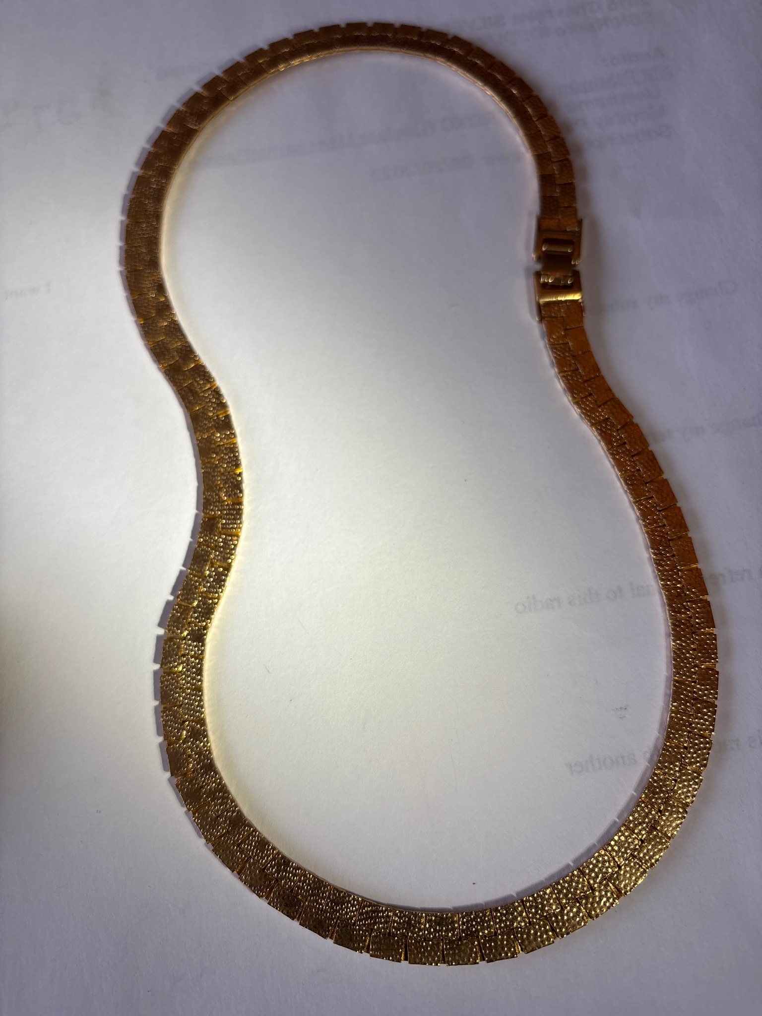 This is a vintage gold-toned collar-style necklace, likely dating from the 1960s to 1980s. The piece features a unique articulated construction consisting of interlocking rectangular panels that create a flexible, mesh-like fluidity. Each panel is decorated with a distinct stippled or 'nugget' textured finish, which provides a high-sparkle effect under various lighting conditions. The necklace is uniform in width throughout its length, terminating in a fold-over style clasp that integrates seamlessly with the design. Measuring approximately 16 to 18 inches in length, the piece is designed to sit flat against the neckline. The material appears to be gold-plated base metal or a gold-tone alloy, exhibiting a warm yellow hue characteristic of mid-century costume jewelry. While no specific maker's marks are clearly visible in the overview, the quality of the articulation suggesting high-end costume production similar to brands like Monet or Trifari. The condition appears very good, with no visible loss of plating or significant kinking in the links, though minor surface wear consistent with age may be present upon closer inspection. The weight and drape indicate a solid manufacturing quality, intended to mimic the appearance of fine jewelry.