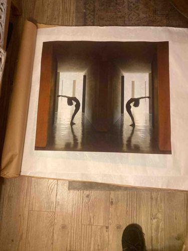 This item is a large-format photographic print documenting the performance 'Relation in Time' (1977) by the renowned artistic duo Marina Abramović and Ulay. The image features a symmetrical, mirrored composition of the performers, showcasing their bodies in arched, backbend-like poses within a minimalist architectural space characterized by warm sepia and ochre tones. The print appears to be oriented on heavy-weight paper or canvas, currently unframed and displayed flat over brown kraft paper. Physically, the piece demonstrates high-contrast shadows and a reflective floor surface that adds depth to the performance space. There are visible undulating ripples in the paper substrate, suggesting a lack of mounting, which is common for larger prints. The condition seems generally good, though the edges and corners require careful handling to prevent creasing. Given the provided context of the artists, this work represents a pivotal moment in 20th-century performance art history. Authentic prints of this series are typically part of a limited edition, often signed or numbered on the verso or margin, and are considered highly significant in the contemporary art market. The craftsmanship is evident in the professional lighting and the balanced geometric composition that characterizes Ulay and Abramović’s documentation style from the late 1970s.