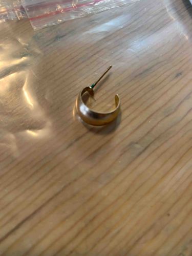 This item is a single, small gold-tone J-hoop style earring designed for pierced ears. The earring features a classic domed or 'puffy' aesthetic, curving approximately three-quarters of the way into a circle. It is fashioned from a yellow-gold-colored metal, though the specific karat weight or metal composition (such as solid gold versus gold-plated) cannot be definitively determined from the visual alone. The exterior surface has a polished finish that shows significant light reflection, suggesting a smooth, rounded contour. Notable condition issues include visible green oxidation or tarnish (verdigris) at the junction where the post meets the hoop body, which often indicates the presence of a base metal like copper or brass underneath a gold plating. The earring post appears straight but lacks a butterfly or friction back. There are no clearly visible maker's marks or hallmarks in the provided perspective. Based on the sculptural, minimalist design and the specific type of wear, this piece likely dates from the late 20th century, specifically the 1980s or 1990s, when bold but simple gold-toned jewelry was highly popular. The craftsmanship appears to be mass-produced costume jewelry rather than fine artisanal work, given the visible corrosion on the post-to-hoop joint.