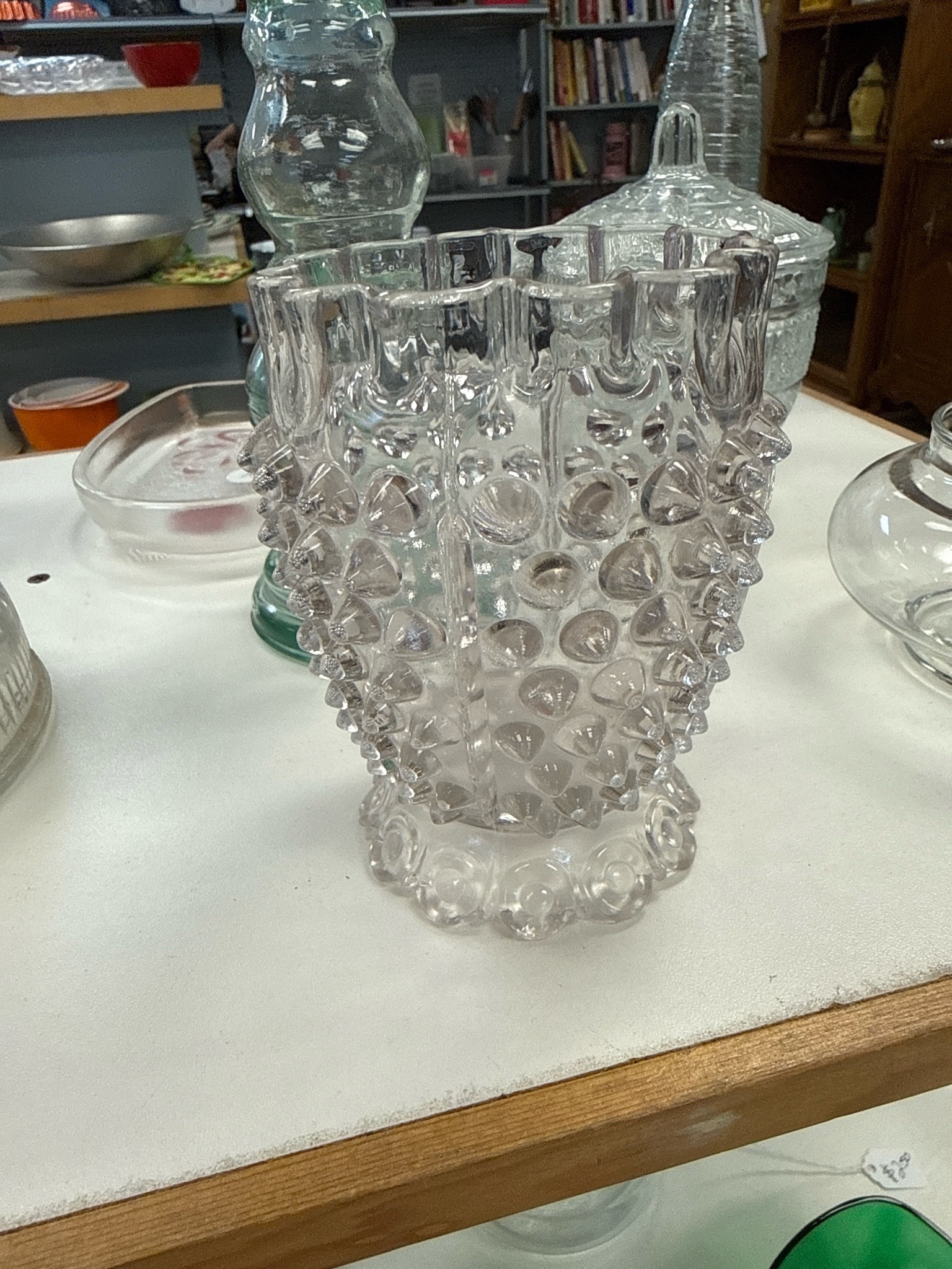 This is a medium-sized clear press-molded glass vase featuring a prominent hobnail pattern, which is a classic design characterized by raised, rounded protrusions covering the exterior body. The object is constructed from thick, transparent glass and stands on a scalloped circular pedestal base. The body tapers slightly from a wide, ruffled or crimped rim down toward the base. Vertically oriented mold seams are visible, indicating the manufacturing process. The style is synonymous with mid-century American decorative glassware, likely produced by the Fenton Art Glass Company during the mid-20th century (circa 1940s-1960s). The glass appears to have a slight grayish or purplish tint, which can sometimes occur in vintage glass due to sunlight exposure or chemical composition (manganese content). The overall condition appears excellent with no visible chips to the delicate 'hobs' or the ruffled rim. The base exhibits a scalloped ring of larger rounded nodes providing stability and an ornate finish. This type of utilitarian yet decorative art glass was a staple in American households for floral arrangements and remains a popular collectible for its tactile texture and light-refracting qualities.
