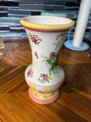 This is a medium-sized decorative ceramic vase featuring a distinct baluster or hourglass silhouette. The piece is constructed from a glazed earthenware or porcelain material with a creamy white base color. The decoration consists of a whimsical, shabby-chic style floral motif featuring pink roses and small yellow accent flowers with green foliage, likely applied via transferware or decals. A notable aesthetic feature is the use of contrasting patterns: the upper rim is finished in a solid yellow band, followed by a pink scalloped border, while the lower body transitions into a yellow and white vertical stripe pattern. The foot of the vase is particularly ornate, featuring a flared shape with pink and yellow banded details and a repeating green vine pattern. In terms of condition, there is visible fine crazing throughout the glaze on the upper neck, which is indicative of age or thermal stress. A significant vertical hairline crack is also visible extending downward from the rim on the right side. The overall style is reminiscent of late 20th-century 'Cottagecore' or heritage-style kitchenware, often produced by brands like MacKenzie-Childs or similar boutique ceramicists. The craftsmanship shows a combination of molded production and manual decorative application.