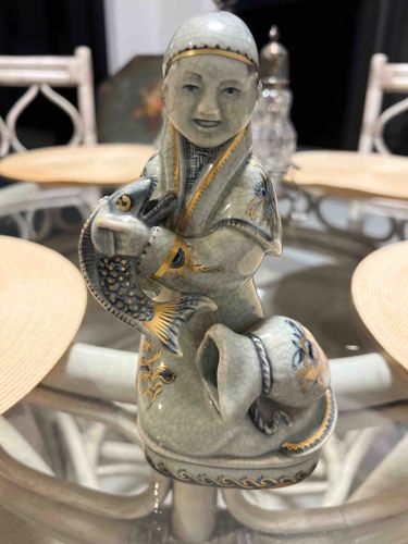Fitz and Floyd Chinoiserie Crackle Glaze Figurine of a Boy holding a Fish