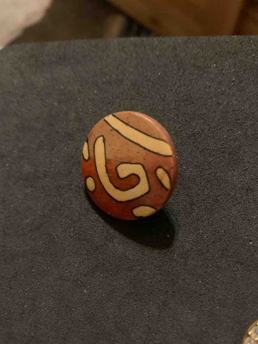 This item is a circular, dome-shaped object, likely a decorative bead, button, or lapel pin component, measuring approximately 1.5 to 2 centimeters in diameter. It is crafted from a ceramic or polymer clay material, featuring an earthy terracotta-brown base glaze with hand-painted cream-colored abstract 'bogolan' or tribal-inspired motifs. The aesthetic is characteristic of Studio Pottery or Artisanal jewelry movements from the late 20th century, specifically the 1970s through the 1990s. The surface exhibits a subtle matte finish with fine dark speckles embedded within the clay body, suggesting a rustic, high-fire ceramic process or a deliberate inclusion of 'grit' in a clay medium. The pattern consists of primitive swirls, dots, and curvilinear lines outlined in a darker pigment, reminiscent of West African textile patterns. Condition-wise, the item appears in good vintage state with no visible chips, cracks, or significant abrasions on the face. There is a slight unevenness in the circular perimeter, which confirms its handmade, non-industrial origin. The craftsmanship reflects an individual artisan's hand, prioritizing organic texture and folk-art style over mechanical symmetry. No maker's marks or stamps are visible from the top view, though they might exist on the reverse side.