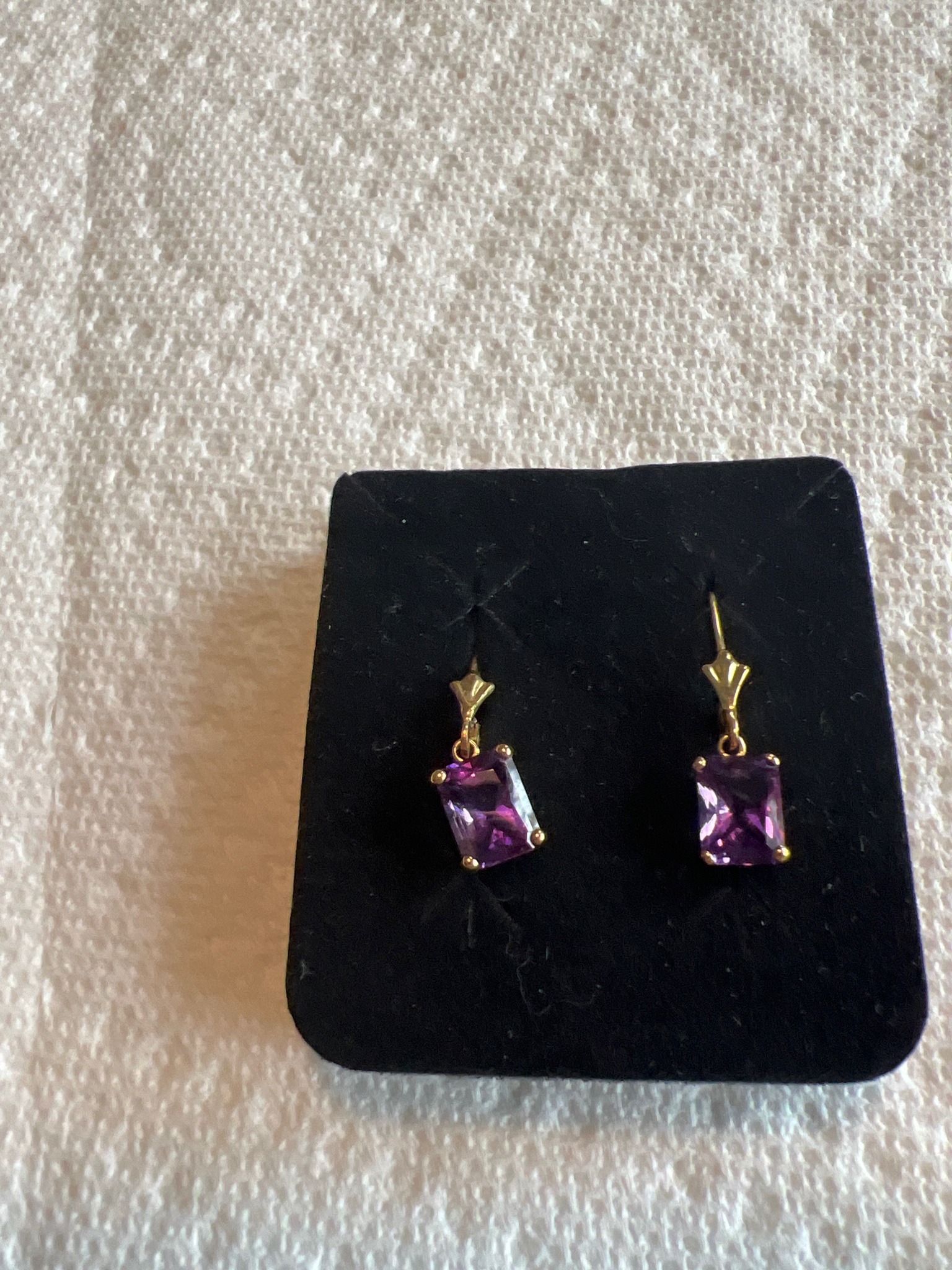 A pair of fine jewelry earrings featuring two vibrant, emerald-cut purple stones, likely amethysts, set in a yellow gold mounting. The stones are step-cut with rectangular facets, exhibiting a deep, saturated violet hue with excellent clarity and light return. Each stone is secured in a classic four-prong basket setting, which is suspended from a decorative V-shaped gold bail. These bails are connected to lever-back or shepherd-hook style ear wires, providing a secure and elegant dangling movement. The metal appears to be at least 14k yellow gold, judging by the luster and color. The construction is solid and symptomatic of modern classic jewelry design, likely dating from the late 20th century to the present. The stones appear well-matched in color and size, approximately 8x6mm. Condition is excellent with no visible chips to the facets or fatigue in the gold components. The earrings are presented on a black velvet display card, which is common for retail presentation or storage. The overall craftsmanship suggests a high-quality commercial production aimed at timeless appeal.