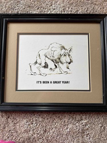 This item is a framed illustrative print featuring a satirical cartoon of a malnourished and bedraggled wolf or coyote figure. The artwork is rendered in a black ink style, possibly a lithograph or high-quality mechanical print, on a white paper background. The central figure is depicted with visible ribs, a drooping tongue, and a weary expression, contrasted by the ironic caption 'IT'S BEEN A GREAT YEAR!' printed in bold, black sans-serif capital letters below the illustration. The piece is professionally matted with double matting: a tan or light brown outer mat and a thin white inner mat accentuating the artwork's border. The frame is a dark, possibly black-lacquered wood or composite material, featuring a decorative beaded inner edge and a simple rounded outer profile. In terms of condition, there are visible scuffs and finish wear on the black frame, particularly along the lower outer edge. The matting appears consistent in color, though there may be minor dust ingress under the glass. This piece exemplifies mid-to-late 20th-century office or satirical humor, often found in corporate settings to comment on economic hardships or difficult business cycles. The craftsmanship of the framing suggests it was intended for wall display, using standard commercial framing techniques from the 1980s or 1990s.