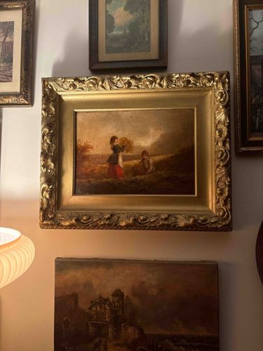 This item is an original oil painting on canvas or panel, housed in a substantial and highly ornate giltwood frame. The composition depicts a genre scene featuring two rural figures—likely children—gathering wheat or hay in a fall landscape. The central figure is dressed in a vibrant red skirt and dark bodice, characteristic of 19th-century European peasant attire. The painting utilizes a warm, earthy palette with soft transitions in the sky and background, suggesting a Late Victorian or Romanticist influence from the mid-to-late 19th century. The framing is a significant component of the item's presentation: it consists of a wide, deeply molded cove-style frame with elaborate scrolling foliate and acanthus leaf ornamentation along the outer edges, finished with a bright gold leaf or gilt-painted surface. The inner liner is a matte-finish gold slip. Regarding condition, the frame appears largely intact but shows minor surface dust and typical age-related darkening of the gilding. The painting surface exhibits some darkening due to oxidized varnish, which is common for its age, though there are no immediate signs of significant paint loss or structural damage visible. The overall craftsmanship of the frame indicates a high-quality historical production intended for an upper-mid-range market.
