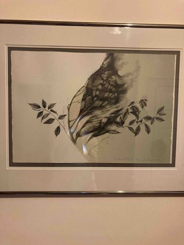 This is a fine art lithograph or mixed media work on paper by the renowned Southwest artist Frank Howell, dated 1980. The piece features Howell's signature ethereal and surrealist style, blending botanical elements with mystical human forms. Specifically, the composition displays a leafy branch where the central mass of leaves and shadows morphs into stylized, stacked faces or spirits with flowing, smoke-like hair. The artwork is characterized by a monochromatic or limited palette of muted greys, blacks, and soft greens, creating a dreamlike quality. It is executed on high-quality deckle-edged paper, which is float-mounted inside a professional mat to showcase the uneven edges of the support. The craftsmanship is evident in the fine, rhythmic line work and the smooth gradients of the shading. In the lower right corner, there appears to be a pencil signature and date ('Frank Howell 1980'). The piece is housed in a contemporary silver-toned metallic frame behind glass. It appears to be in excellent condition with no visible foxing, yellowing, or paper waviness, though the frame shows standard light reflections. The style is quintessential Contemporary Southwest Art from the late 20th century, focusing on the spiritual connection between nature and humanity.