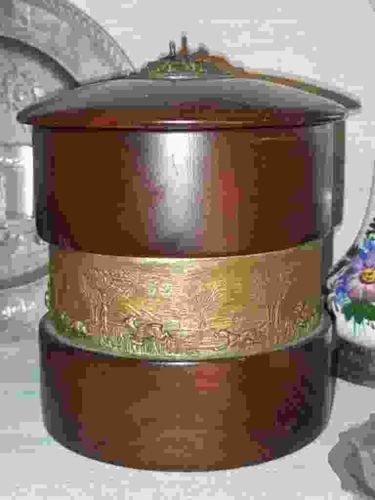 This is a cylindrical humidor or storage jar, characteristic of the Arts and Crafts or Mission style, likely dating from the early 20th century (circa 1900-1920). The vessel is constructed primarily of dark-stained wood, possibly oak or mahogany, with a smooth, semi-gloss finish. The central body features a wide, decorative copper band with intricate repoussé metalwork. This band depicts a pastoral or hunting scene with figures, trees, and dogs, exhibiting a greenish copper-carbonate patina (verdigris) in the recessed areas which highlights the relief. The lid is slightly domed with a matching wooden finish and is topped with a metal finial that may have served as a handle or a venting mechanism. The construction displays a blend of organic materials and industrial metalcraft typical of the period's aesthetic. Condition wise, there is visible surface wear to the wood including minor scuffs and a dulling of the original finish. The copper band shows oxidation consistent with age. There are no immediate signs of major structural repair, though the metalwork shows slight deformation at the edges where it meets the wood. The interior likely contains a ceramic or metal liner to maintain humidity, though it is not visible in this view.