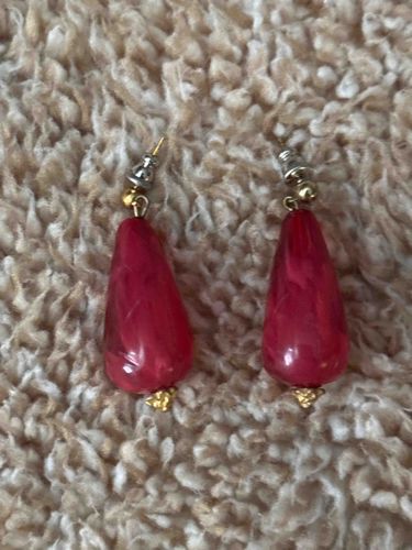A pair of drop earrings featuring elongated, teardrop-shaped focal beads in a vibrant magenta or deep raspberry red. The beads exhibit a textured, swirling pattern reminiscent of carved cinnabar or molded resin, though the high-gloss finish suggests a plastic or acrylic composition typical of late 20th-century costume jewelry. Each drop is accented by a small, gold-toned ornamental flower or petal-shaped bead cap at the base, adding a touch of floral detail. The earrings are designed for pierced ears, utilizing a post configuration with standard silver-toned metal butterfly clutches or tension backs. The hardware appears to be made of base metal with a thin gold-colored plating, as evidenced by slight tonal variations between the connector loops and the lower decorative caps. The overall construction displays modest craftsmanship, with the focal beads measuring approximately 20-25mm in length. Condition appears fair to good: the beads retain their luster, though there is visible minor tarnishing or gold-plating wear on the metal findings, particularly near the top loops. No distinct maker's marks are visible, dating these pieces likely to the 1980s or 1990s as mass-produced fashion accessories.