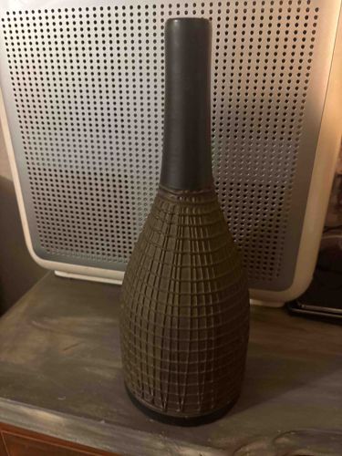 This is a tall, slender ceramic bud vase embodying the Mid-Century Modern or 'Atomic' aesthetic, likely dating from the 1960s. The vessel features a dual-texture finish: a smooth, matte black cylindrical neck that transitions into a bulbous mid-section decorated with a prominent, incised lattice or cross-hatched pattern. This textured lower body exhibits a sage green or grayish-brown glaze within the recesses of the grid, creating a striking contrast against the dark clay body. The construction appears to be wheel-thrown or slip-cast with manually applied surface detailing. The piece stands approximately 8 to 10 inches tall. Characteristic of Scandinavian or German studio pottery (often referred to as 'Fat Lava' era styles), the vase shows high craftsmanship in its symmetrical form and the precision of the textural relief. Condition-wise, the exterior surface appears well-preserved with no visible chips, cracks, or structural repairs. Some minor surface patina or dust is noted in the deep grooves of the lattice work, common for unglazed or matte-finished ceramics of this age. No maker's marks are visible on the side, but such pieces often feature incised numbers or hallmarks on the base indicating the manufacturer, such as Rosenthal Netter or Bitossi.